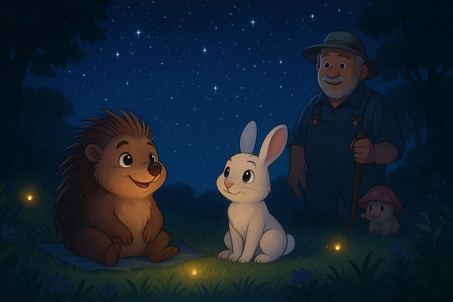 In the distance, Percy could see his friend Pete, the park keeper, who was out this evening hunting for mushrooms with his mushroom piggy called Scratching. Pete was always eager to help Percy and his park friends. Together, they found a cosy spot on a grassy hill, where the view of the night sky was clear and breathtaking. They spread out a soft blanket and invited Ellie to join them.
